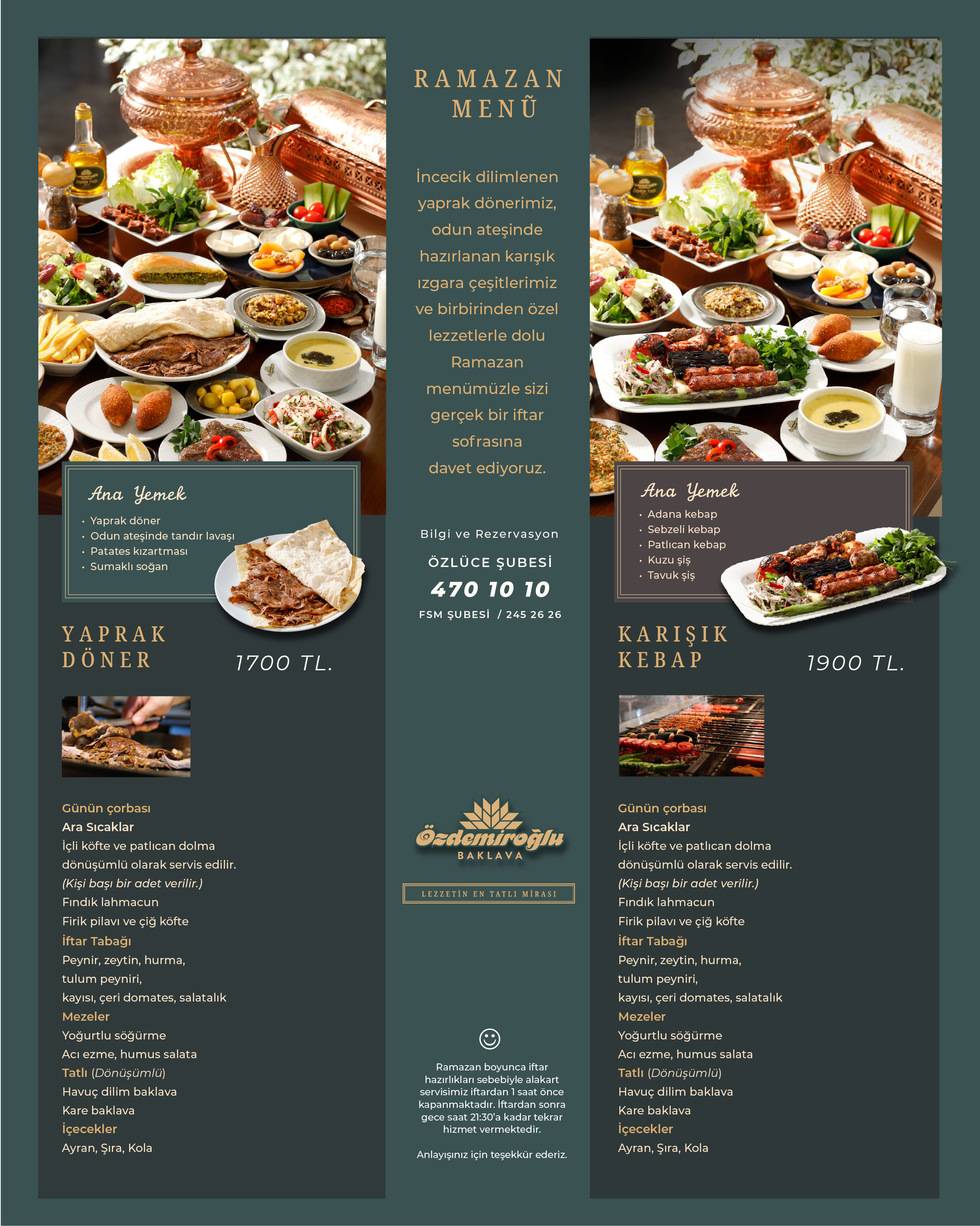 Başlıca ürünlerimiz geleneksel tatlılar ile Antep mutfağının özgünyemekleri ve kebaplarıdır: