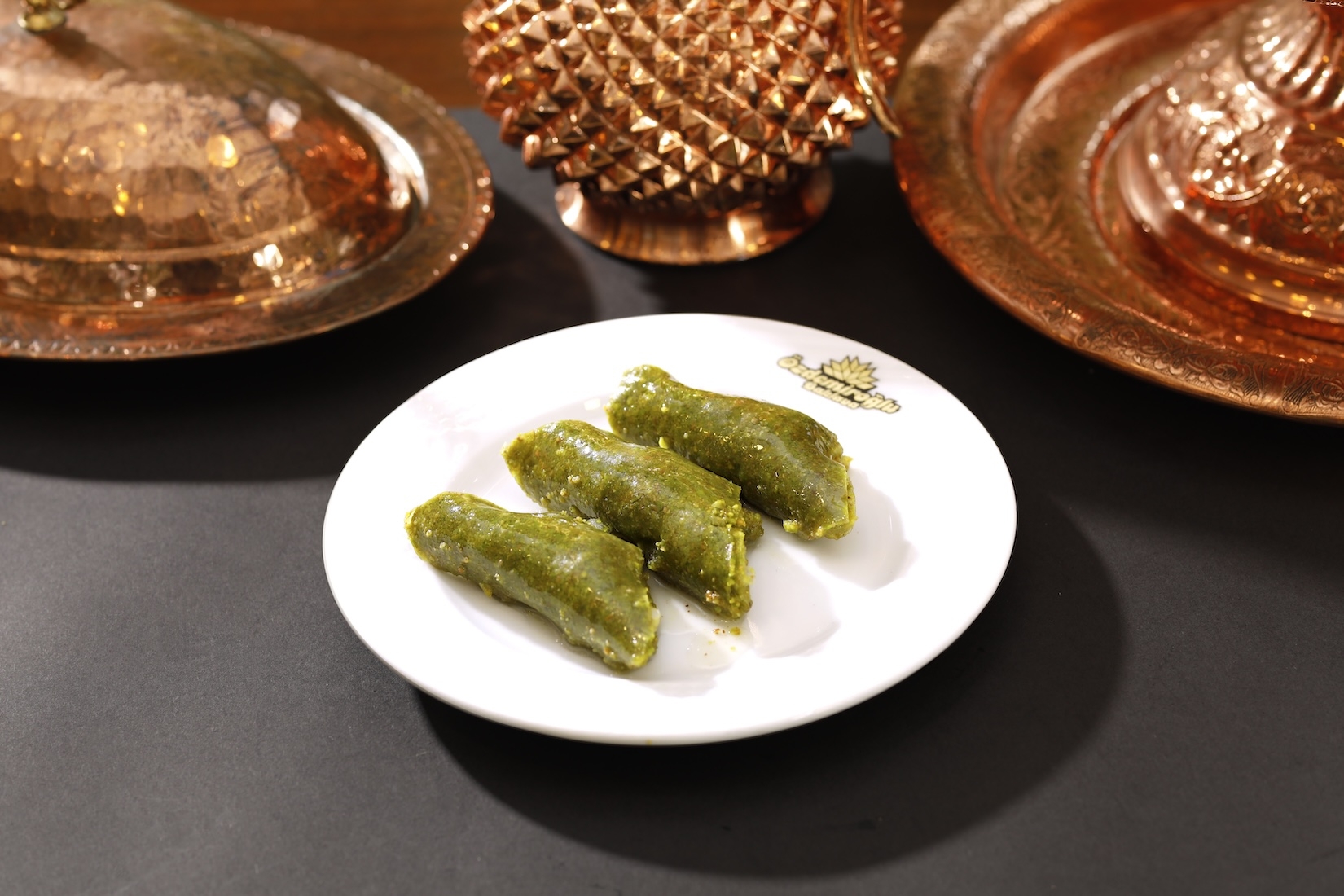 İnce yufkaya sarılı fıstıklı rulo tatlı.